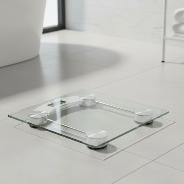 Balanza digital de baño con superficie de vidrio templado, diseño moderno y elegante que combina con cualquier espacio.