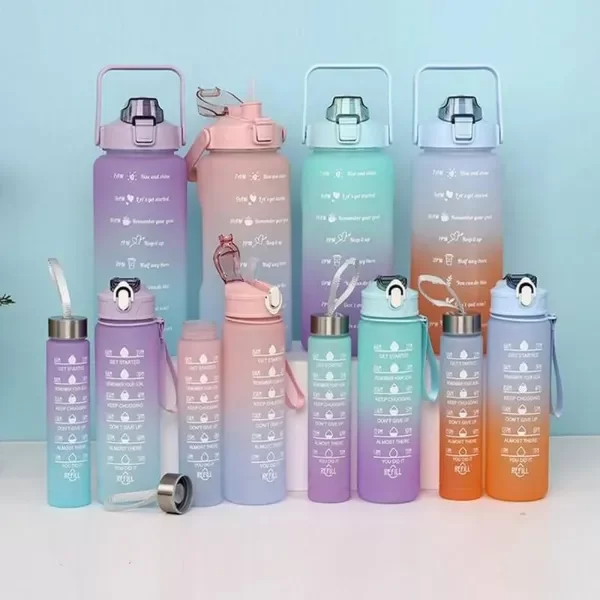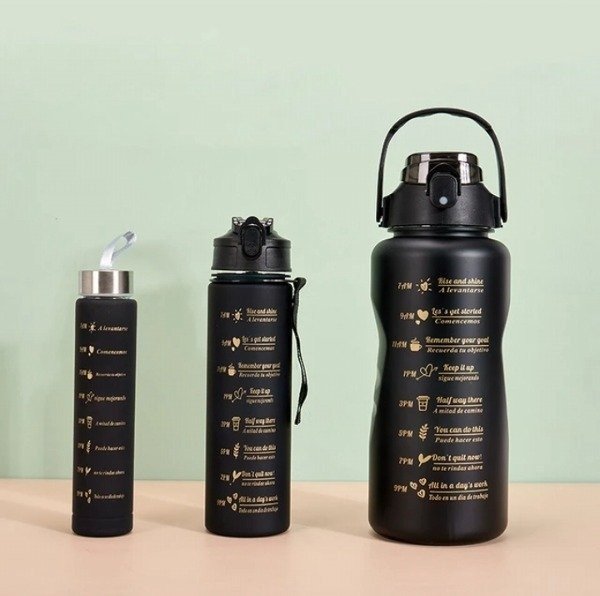 Set de botellas motivacionales ideal para mantenerte hidratado durante todo el día. Incluye 3 botellas de distintos tamaños, para que puedas usarlas juntas o por separado según el momento.