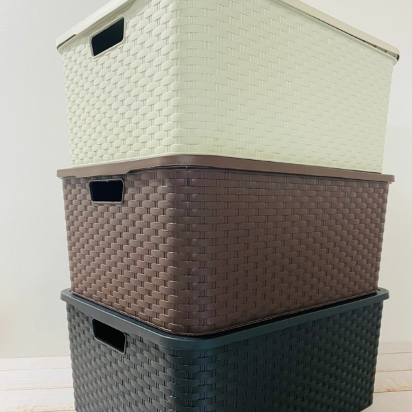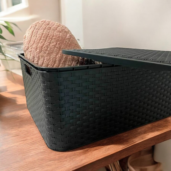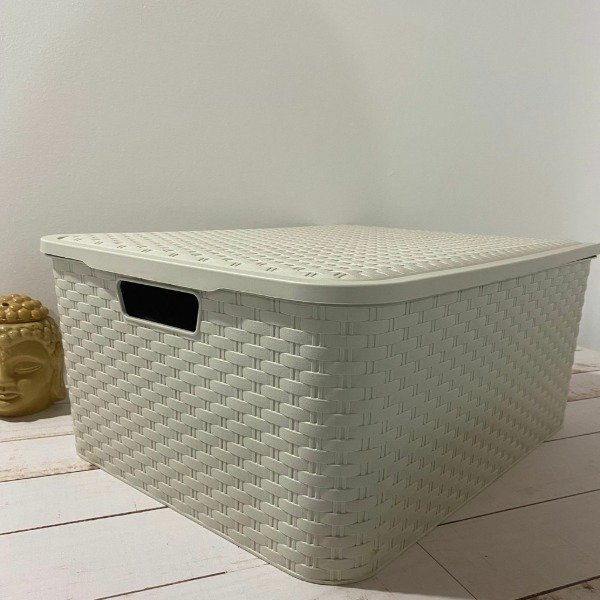 Caja organizadora práctica y linda, ideal para guardar y mantener todo en orden. Su diseño simil ratán queda bien en cualquier espacio y la tapa ayuda a que todo quede más prolijo.