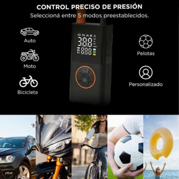 El compresor de aire recargable Lambotech es una herramienta portátil y práctica ideal para inflar neumáticos de autos, motos, bicicletas, pelotas y otros inflables de forma rápida y sencilla.