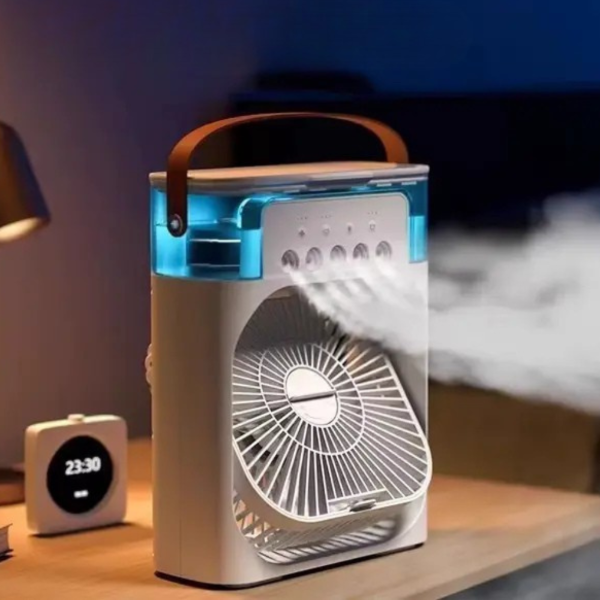 Humidificador portátil con ventilador integrado que ayuda a refrescar y humidificar el ambiente, generando una brisa más agradable.