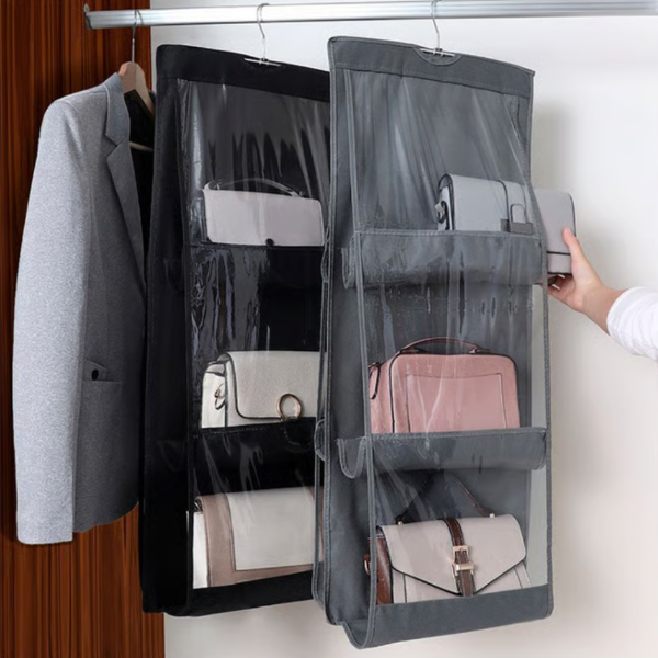 Práctico organizador colgante ideal para guardar carteras, bolsos y accesorios de forma ordenada y visible.