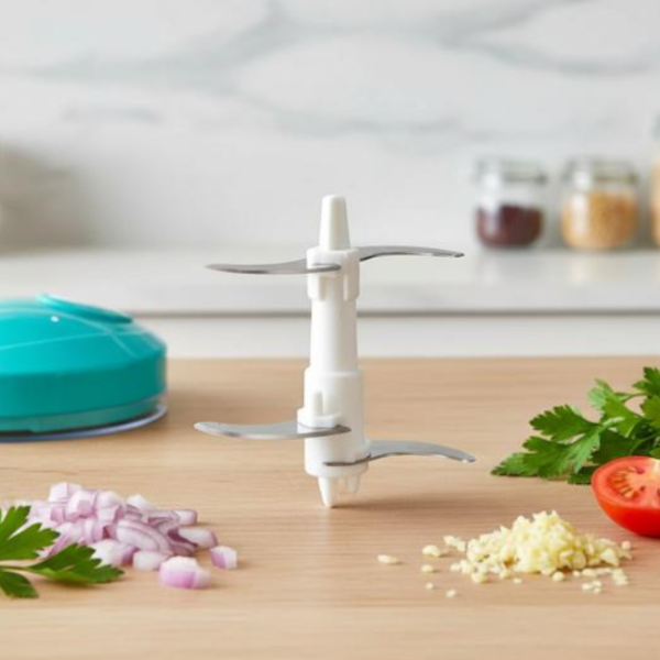 Su sistema de cuchillas giratorias accionadas por cuerda permite picar distintos ingredientes en pocos segundos, logrando un corte uniforme sin esfuerzo.